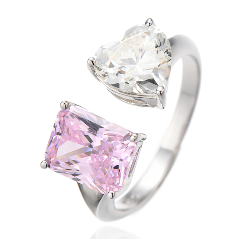 4.29Anello aperto in argento rodiato con zircone cubico e diamanti rosa a forma di cuore e ottagono
